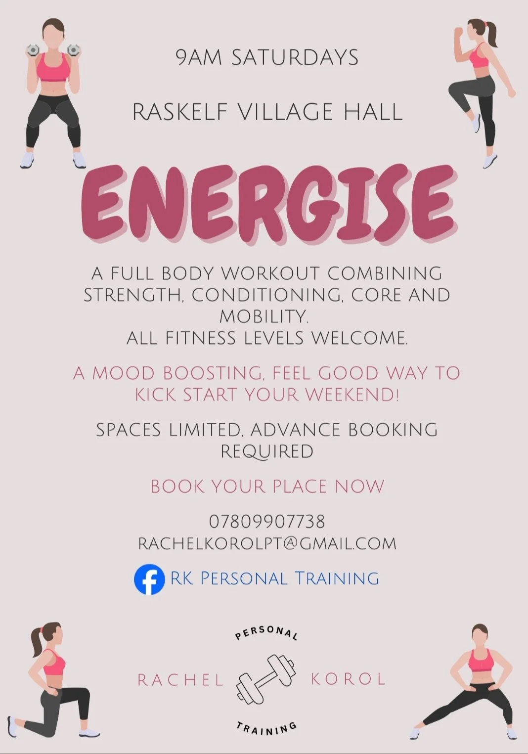 Start your weekend strong with Energise; a full body workout focusing on improving overall strength and increasing cardiovascular fitness. We incorporate a variety of bodyweight and equipment based exercises and all exercises can be modified to suit individual fitness levels. The workout is different each week and promises to deliver a mood boosting, heart pumping start to your Saturday morning!