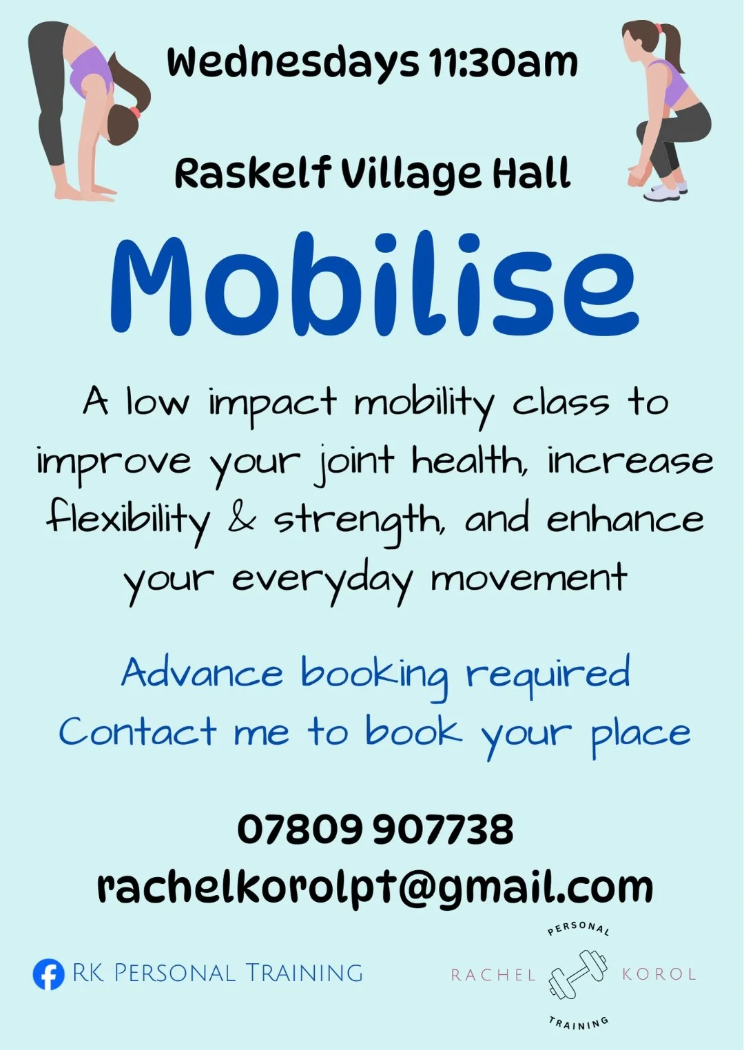 Mobilise is ideal if you’re looking for a low impact exercise class in a group training environment. Each week we run through a variety of mobility drills to help keep our joints healthy as well as some strength work using body weight or light resistance bands to keep our muscles fit and strong. All exercises can be done from a standing or seated position so it is accessible for all.